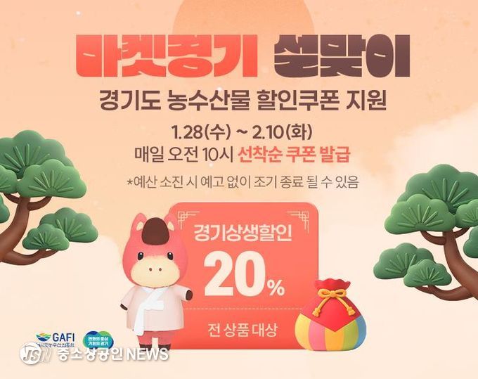 매일 오전 10시 경기도 농수축산물 온라인쇼핑몰 ‘마켓경기’를 방문하면 경기미, 농수축산물, 가공식품 등 모든 상품을 20% 할인가에 구매할 수 있는 ‘2026 설맞이 할인쿠폰’이 선착순 지급된다.