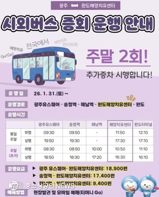 완도군은 완도해양치유센터와 송정역을 경유하는 시외버스 노선을 1월 31일부터 주말에는 왕복 2회로 확대 운행한다.