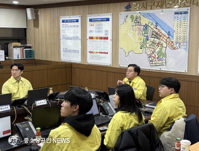 진교훈 서울 강서구청장이 1일 밤부터 2일 새벽 사이에 서울 전역에 많은 눈이 내릴 것이 예보됨에 따라 구 제설대책본부를 찾아 제설대응 체계를 점검했다.