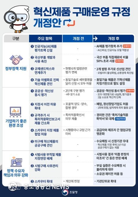 조달청은 공공분야 혁신조달을 확대하여 우리 경제의 혁신 성장을 견인하기 위해 '혁신제품 구매 운영 규정'을 개정하여 2월 3일부터 시행한다.