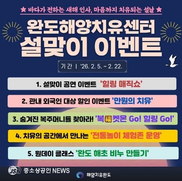 완도군은 설 명절을 맞아 귀성객, 군민, 관광객이 그동안 쌓인 피로를 풀고 활력을 얻을 수 있도록 ‘완도해양치유센터, 설맞이 힐링 이벤트’를 2월 5일부터 22일까지 운영한다.