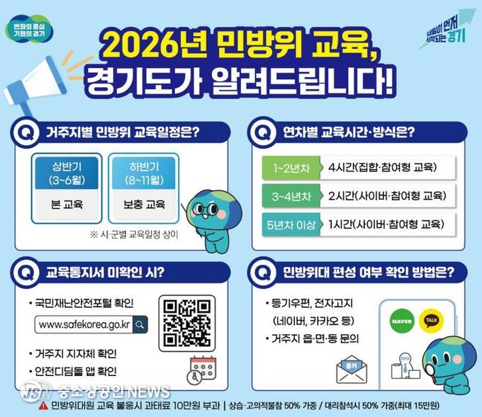 경기도가 ‘2026년도 민방위 교육’과 관련해 도민들의 편의를 위해 시군별 문의가 많은 사항을 중심으로 교육대상·교육시간·교육방법을 안내했다.