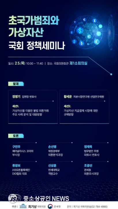 관세청은 최기상 국회의원(더불어민주당·서울 금천구)과 공동으로 2월 5일 국회 의원회관에서 '초국가범죄와 가상자산: 국경을 넘어선 불법 자금 흐름 대응' 국회 정책 세미나를 개최했다.