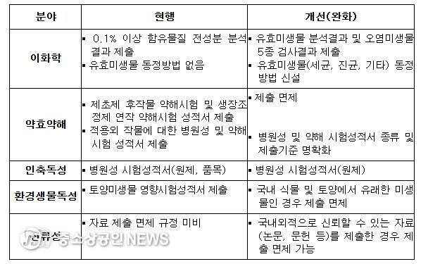 또한, 이화학 분야에서는 유효 미생물 동정 방법과 오염 미생물 범위를 정했고, 약효 약해 분야에서는 병원성 시험의 방법과 기준을 명확하게 했다. 독성 분야에서는 원제와 품목 모두 제출했던 병원성 시험에서 원제만 제출하도록 완화했다. 토양미생물영향시험은 국내 유래 미생물은 면제하고, 국내외적으로 신뢰할 수 있는 자료를 제출하면 시험성적서를 대체할 수 있도록 했다.