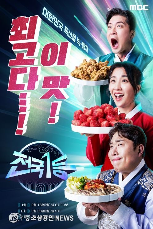 공개된 메인 포스터에는 한복을 차려입은 세 명의 진행자가 각 지역을 대표하는 특산물을 손에 들고 감탄하는 모습이 담겼다. 치킨, 돼지고기, 딸기 등 누구에게나 익숙한 먹거리가 전면에 배치되며, 설 명절에 어울리는 풍성하고 친근한 분위기를 완성한다. 특산물을 바라보는 세 사람의 표정에는 놀라움과 기대가 자연스럽게 담겨 있어, 프로그램의 콘셉트와 현장 분위기를 어렵지 않게 떠올리게 한다. 역동적인 구도와 선명한 색감은 전국 각지의 특산물이 한자리에 모여 맞붙는 장면을 효과적으로 그려내며, 명절을 맞아 펼쳐질 특별한 대결에 대한 기대를 더한다. 여기에 “최고다… 이 맛!”이라는 문구는 현장에서 터져 나오는 생생한 반응을 전하며, 설 특집 '전국1등'이 전할 재미를 자연스럽게 예고한다.