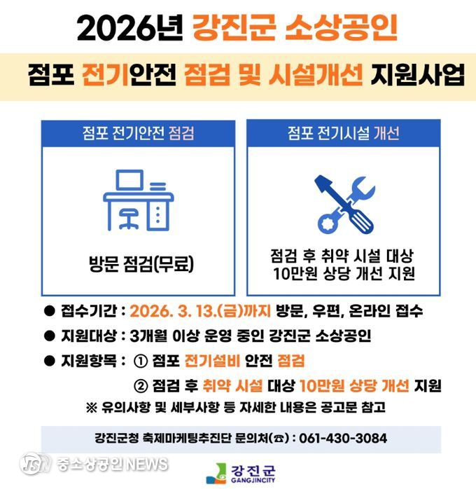 강진군이 소상공인 사업장의 전기시설을 점검하고 개선하여 화재 등 재난 예방을 위해 안정적인 점포 환경을 조성할 수 있도록 지원사업을 모집한다.