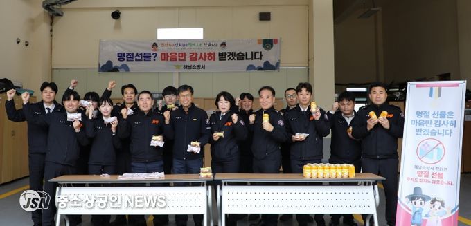해남소방서(서장 박춘천)가 10일 오전 본서 차고지에서 설 명절을 맞아 청렴한 공직문화 확산과 건전한 명절 문화 정착을 위해'청렴한 세상 함께 만들어요'캠페인을 실시했다.