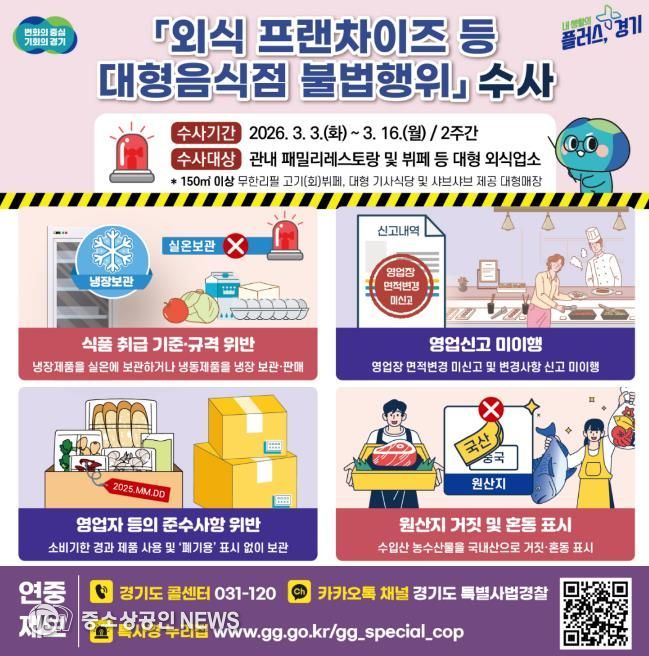 최근 뷔페식, 패밀리레스토랑 등 대형 외식업소 이용이 늘어난 데 따라 진행되는 이번 수사는 오는 3월 3일부터 16일까지 2주간 수원·의정부·부천·성남 4개 수사센터에서 진행할 예정이다.
