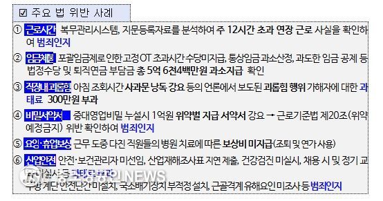 한편, 1~3개월의 단기 근로계약 체결, 휴게시간 중 사업장 이탈 금지 등 자유롭지 못한 휴게 및 휴가 사용 정황, 업무상 실수에도 과도한 시말서 요구 등 조직문화 전반에 대해서도 개선지도 했다.