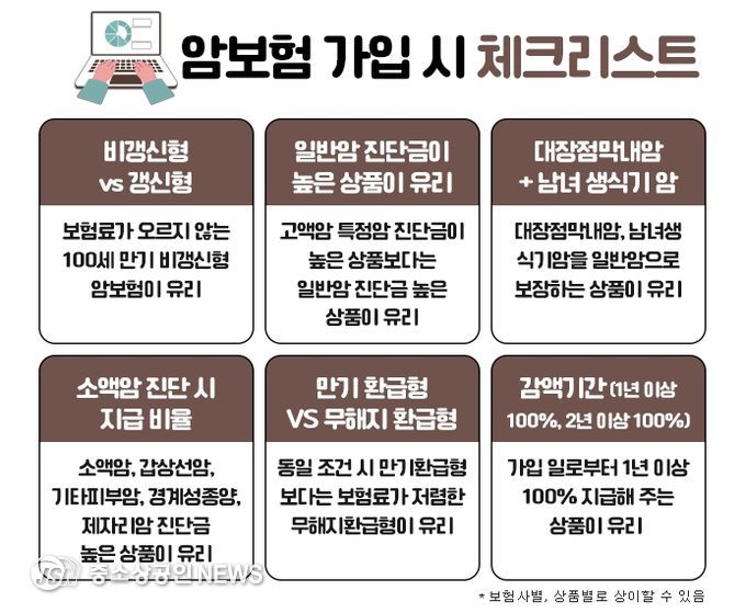 우선, 암보험을 가입하기 위해서는 갱신형 상품과 비갱신형 상품중에서 선택을 해야 한다. 갱신형은 처음 가입 시에는 보험료가 상대적으로 저렴하지만 갱신을 이어가면서 보험료가 계속 인상될 수 있고, 비갱신형은 초기 보험료는 갱신형보다 높을 수 있지만, 가입 후에 보험료인상이 없어 안정적으로 유지관리가 가능한 장점이 있다. 따라서 이러한 장단점을 고려하여 본인의 상황에 맞게 선택하는 것이 좋다.