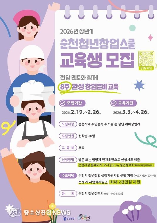 순천시는 창업을 준비하는 지역 청년들의 아이디어를 구체화하고 체계적인 사업화를 지원하기 위해 '2026년 상반기 순천청년창업스쿨' 교육생을 오는 19일부터 26일까지 모집한다고 밝혔다.