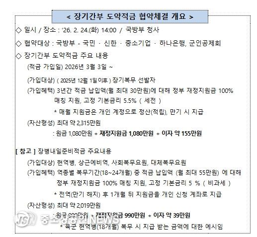 안규백 국방부장관 주관으로 2월 24일, 국방부 청사에서 국민은행, 신한은행, 중소기업은행, 하나은행, 군인공제회와 ‘장기간부 도약적금’ 업무협약을 체결하고, 협약 이행을 위해 상호 긴밀히 협력할 것을 약속했다.