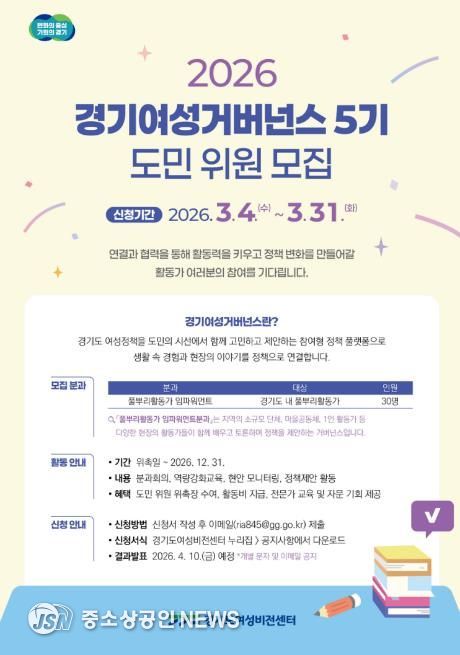 경기도여성비전센터가 2026년 ‘경기여성거버넌스’에서 활동할 도민위원을 오는 3월 31일까지 모집한다.