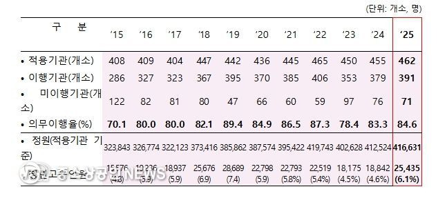 2025년 공공기관 청년고용의무 이행결과에 따르면, 적용기관 462개소의 84.6%(391개소)가 청년고용의무를 이행한 것으로 조사되어 2024년(83.3%, 379개소) 대비 1.3%p(+12개소) 증가했다.