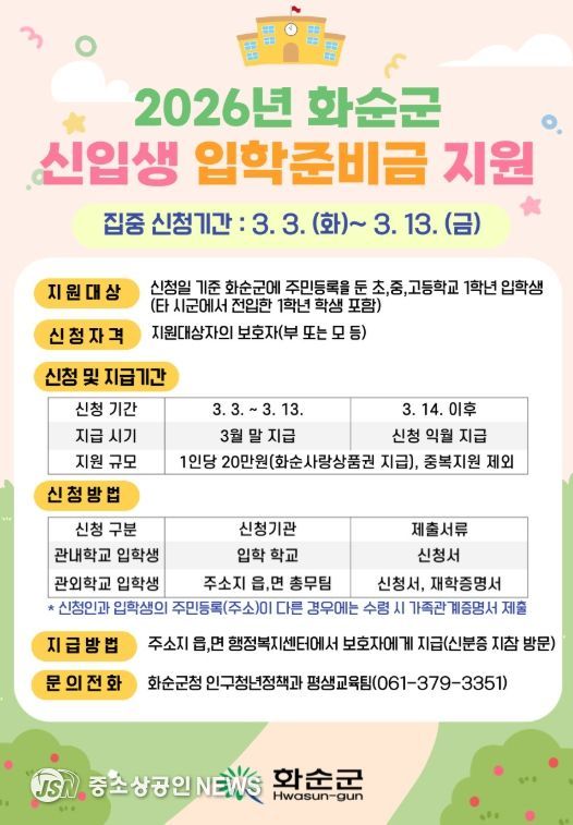 화순군은 2026학년도 초‧중‧고등학교 신입생 가정의 교육비 부담을 완화하고 보편적 교육복지를 실현하기 위해 입학준비금 1인당 20만 원을 화순사랑상품권으로 지원한다고 27일 밝혔다.