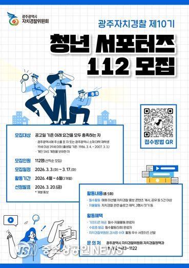 광주광역시 자치경찰위원회는 3일부터 17일까지 ‘제10기 청년 서포터즈 112’ 참여자 112명을 모집한다.