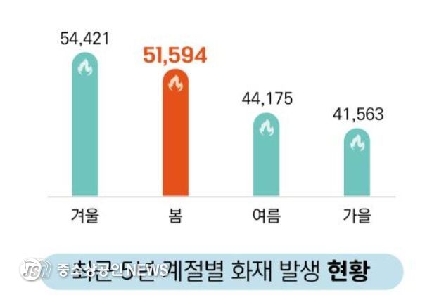 소방청의 최근 5년간(2021~2025년) 통계 분석에 따르면, 봄철(3~5월)에 발생한 화재는 총 5만 1,594건으로 전체 화재의 26.9%를 차지했다. 이는 겨울철에 이어 두 번째로 높은 수치다.
