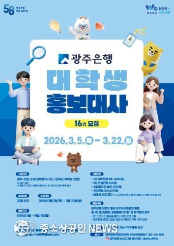 광주은행은 오는 5일부터 광주·전남 지역 소재 대학생을 대상으로 ‘제16기 대학생 홍보대사’를 모집한다고 밝혔다.