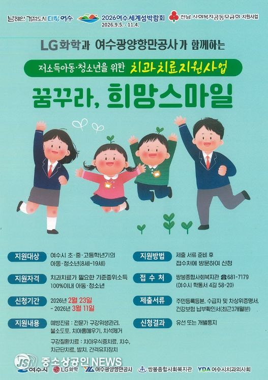 여수시는 민·관이 협력해 저소득 아동·청소년의 구강건강 증진을 위한 치과치료 지원사업 '2026 꿈꾸라, 희망스마일'을 추진한다고 밝혔다.