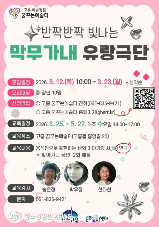 고흥군과 고흥군문화도시센터는 지역 중장년층의 문화예술 향유 기회를 넓히고 지역 예술 자원을 활성화하기 위해 연극 교육 프로그램인 ‘막무가내 유랑극단’을 운영한다고 밝혔다.