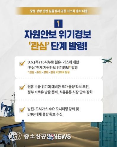 - 3.5.(목) 15시부로 원유·가스에 대한 '관심' 단계 자원안보 위기경보* 발령