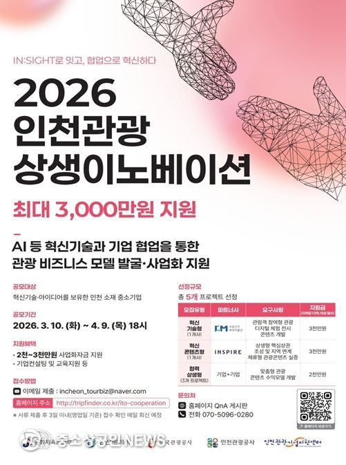 인천광역시와 인천관광공사는 지역 관광 현안 해결과 관광기업의 혁신 성장을 지원하기 위해 ‘2026 인천관광 상생이노베이션’ 공모사업에 참여할 기업을 오는 4월 9일까지 모집한다고 밝혔다.