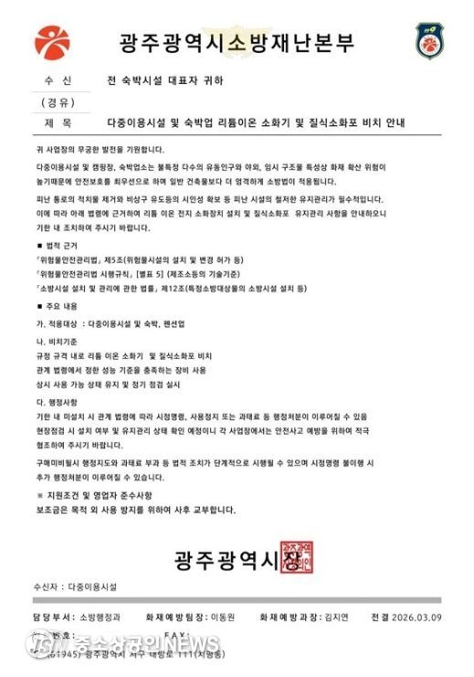 지난 9일 광산구 송정동에서는 한 숙박시설 관계자가 송정119안전센터를 방문해 ‘숙박시설 자동소화장치 설치 안내’ 공문 발송 여부를 문의했다.