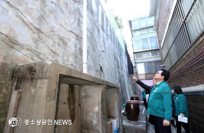 박 구청장은 13일, 사당4동과 상도1동을 방문해 노후 석축·옹벽과 노후 축대·경사면 등의 손상 여부와 안전 상태를 점검했다.