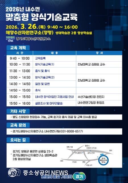 경기도해양자원연구소는 오는 26일 양평에 있는 연구소 생태학습관에서 내수면 양식 어업인의 역량 강화를 위한 양식기술교육을 실시한다.
