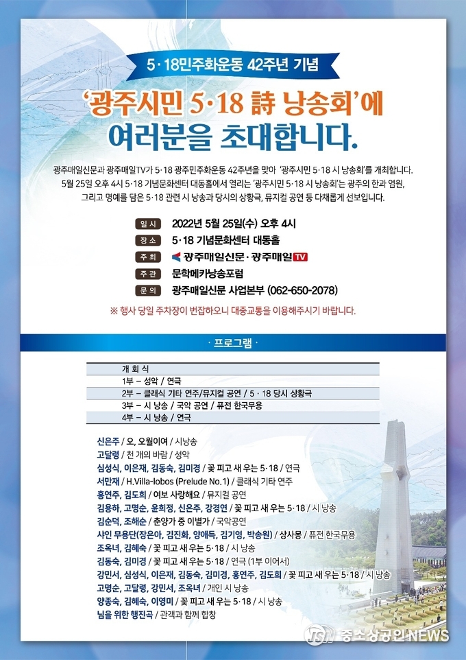 문학메카 낭송포럼(황하택 이사장)은 5·18광주민주화운동 42주년을 맞이하여 ‘광주시민 5·18 시 낭송회’가 성황리에 개최됐다.