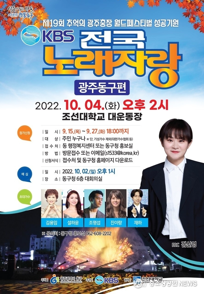 광주 동구(청장 임택)는 오는 10월 4일 조선대학교 대운동장(우천시 동구 다목적체육관)에서 ‘제19회 추억의 광주충장 월드페스티벌’ 성공 개최를 위한 ‘KBS 전국노래자랑-광주 동구편’을 개최한다고 밝혔다.
