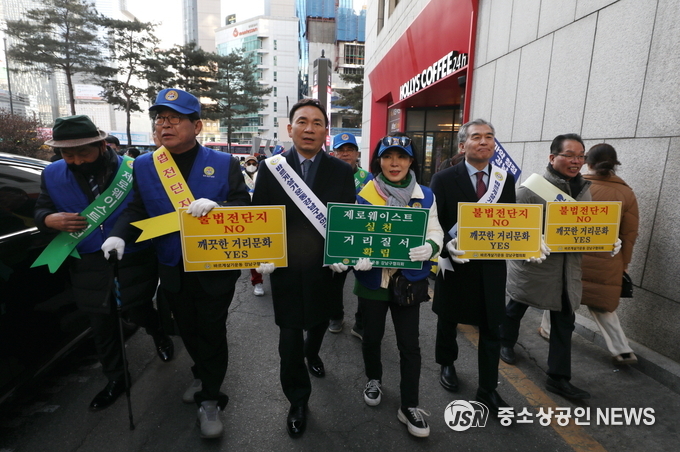 [2023년 3월 바른길 봉사단과 함께 불법전단지 거리캠페인을 하는 조성명 강남구청장 (왼쪽에서부터 세번째)](=출처=강남구청)