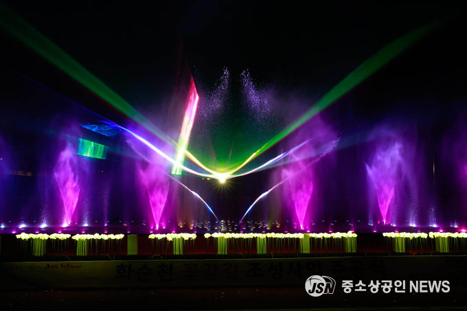 [지난 10월 31일 준공 후 시연 중인 화순천 꽃강길 음악분수의 모습] (출처=화순군청)