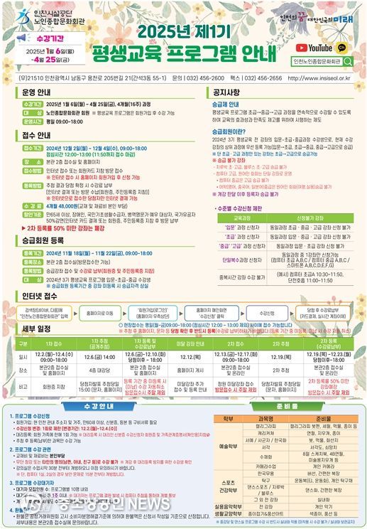 인천시설공단 인천노인종합문화회관은 내달 2일부터 4일까지 2025년 제1기 평생교육 프로그램 수강 신청을 접수받는다고 밝혔다.