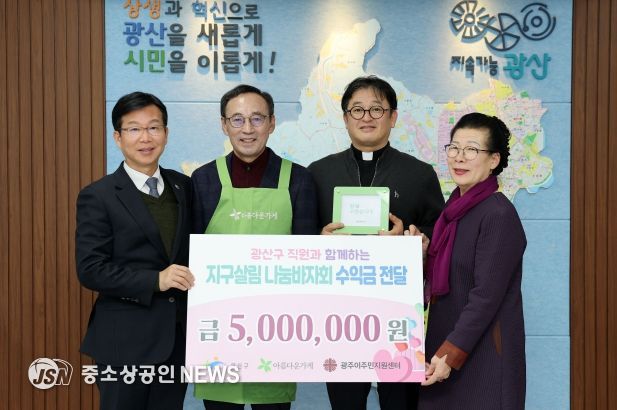광산구는 20일 아름다운가게 광주목포본부가 구청에서 전달식을 갖고 광주이주민지원센터(센터장 황성호 신부)에 지구살림 나눔바자회 수익금 500만 원을 전달했다고 밝혔다.