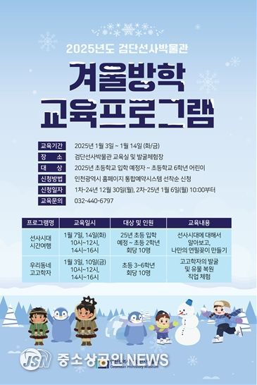 검단선사박물관 겨울방학 교육은 6세부터 초등학교 6학년까지 무료로 참여할 수 있으며, '선사시대 시간여행'은 화요일 오전과 오후에, '우리동네 고고학자'는 금요일 오전과 오후에 2주간 진행된다.