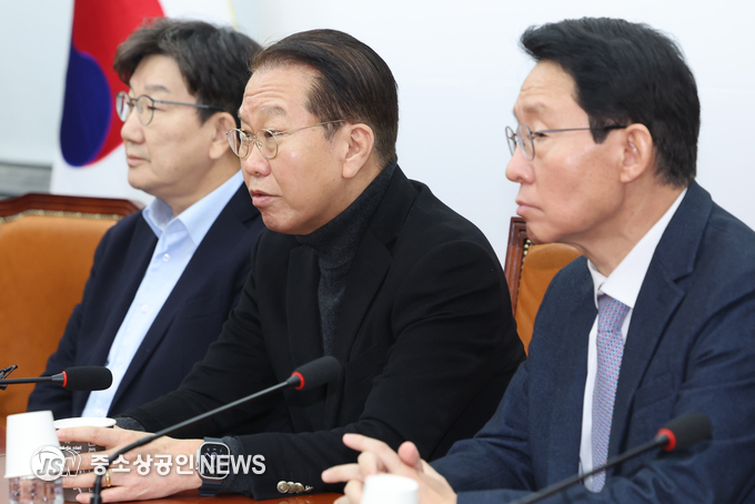 [국민의힘 권영세 비상대책위원장이 윤석열 대통령에 대한 2차 체포영장 집행이 시작된 15일 새벽 서울 여의도 국회에서 열린 긴급 비상대책위원회의에서 발언하고 있다]