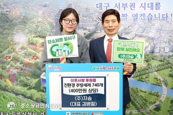 대구 달서구가 ㈜자숨(대표 김병철)으로 부터 관내 어려운 이웃들에게 지원해달라며 친환경 주방세제 740개(400만원 상당)를 기탁 받았다고 17일 밝혔다.