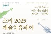 여수시는 오는 11월 16일 이순신광장에서 ‘소리 2025 예술치유페어’를 개최한다. 이번 행사는 ‘소리를 느끼고, 마음을 치유하다’를 주제로 음악·악기·미술 등 다양한 감각 기반 콘텐츠를 시민이 직접 체험하며 예술적 치유를 경험할 수 있도록 마련됐다. 단순 전시 중심의 행사에서 벗어나 공연·체험·전시를 결합해 도심의 문화적 활력과 시민 정서 회복에 기여할 수 있도록 기획됐다. 특히 지역 예술기업, 공예·악기팀 등 다양한 업체가 참여해 지역 기반의 예술 치유 네트워크를 형성하고 마이스 특화전시 사업의 취지인 지역 산업 및 예술기업과의 연계를 강화하는 계기가 될 전망이다. 행사장 내 ‘소리놀이터’에는 무대와 포토존이 운영되며 시간대별 프로그램이 진행된다. 오전 오프닝 체험을 시작으로 국악과 힐링 악기가 함께하는 특별 무대가 펼쳐지며 시민이 직접 악기를 시연해보는 관객 참여형 콘텐츠도 마련된다. 김상욱 여수시 관광과장은 “이번 ‘소리 2025 예술치유페어’는 시민의 심리적 안정과 문화 향유 기회 확대는 물론 여수 마이스 특화전시사업의 방향인 지역 예술 콘텐츠 육성과 도심 회복력 강화에도 부