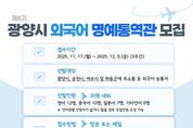 광양시가 국제교류 현장에서 활동할 ‘제8기 외국어 명예통역관’을 모집한다. 광양시 외국어 명예통역관은 시의 국제화 정책 추진과 각종 국제교류 활동을 지원하는 역할을 맡는다. 주요 활동 분야는 국제행사, 해외 방문단 의전, 청소년 국제교류 등에서의 통역 및 안내 업무 수행으로, 시의 요청에 따라 통역에 참여할 경우 '광양시 통역관 위촉 및 운영 규정'에 따른 소정의 통역수당이 지급된다. 제8기 모집 인원은 총 35명(영어 12명, 중국어 10명, 일본어 7명, 기타 언어 6명) 내외이며, 지원 자격은 광양시를 비롯해 순천·여수·하동 등 인근 지역 거주자 중 외국어 능통자 또는 한국어가 능숙한 외국인이다. 선발된 명예통역관은 2026년 1월부터 2027년 12월까지 2년간 활동한다. 신청 접수 기간은 11월 17일부터 12월 5일까지 3주간이다. 희망자는 시 누리집 공고·공지사항에서 신청서를 내려받아 작성한 뒤 이메일로 제출하거나, 광양시 철강항만과 국제협력팀을 방문해 제출하면 된다. 정승재 철강항만과장은 “글로벌 교류가 확대되는 흐름 속에서 전문 통역 인력의 중요성이 더욱 커지고 있다”며 “성장하는