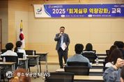 장흥군은 22일 목재산업센터 세미나실에서 회계업무의 전문성 및 실무능력을 향상을 위해 ‘2025년 회계실무 역량강화 교육’을 실시했다. 이번 교육은 신규 공직자 및 예산 업무 담당자 등을 중심으로 회계 및 계약 관련된 업무지식의 습득 및 실무사례 중심의 교육을 통해서 담당자들의 실무 적응력을 높이고 정확한 회계 업무 추진을 통해 행정의 신뢰도를 높이고자 추진됐다. 실무 중심의‘찾아가는 현장교육’으로 진행된 교육은 정부회계연구원 대표 김재곤를 초정해 ▲회계 및 계약 분야 실무 사례 ▲지출 및 계약 집행 절차 ▲주요 사례 공유 및 질의응답 순으로 구성됐다. 특히 회계업무의 기초부터 집행까지 실제 업무를 바탕으로 문제 해결 중심의 교육이 이루어져, 직원들의 역량 향상과 책임의식 제고에 큰 도움이 됐다는 평가다. 노영환 장흥부군수는“빠르게 변화하는 행정환경 속에서 정확한 회계지식과 실무역량은 책임있는 예산관리와 공정한 계약업무 수행에 필수적”이라며, “이번 교육이 실무에 도움이 되는 유익한 시간이 되길 바란다”고 말했다.