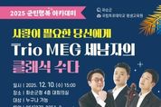 화순군은 '2025 군민행복 아카데미의 마지막 10회차 강연을 오는 12월 10일 오후 3시에 화순군청 4층 대회의실에서 개최한다고 밝혔다. 이번 강연은 클래식 연주단체 Trio MEG를 초청해 ‘사랑이 필요한 당신에게 – Trio MEG 세 남자의 클래식 수다’를 주제로 진행된다. 피아노(김용진)·바이올린(오현)·첼로(윤여훈)의 실내악 연주와 해설을 곁들인 클래식 토크 콘서트 형식으로, 누구나 공감할 수 있는 ‘사랑’을 테마로 재해석한 명곡을 군민들에게 들려줄 예정이다. Trio MEG는 2017년 창단한 클래식 전문 연주단체로 ‘Music makes Everything Grow(음악은 모든 것을 성장시킨다)’를 슬로건으로 활동하고 있다. 50여 곡의 명곡을 재창작해 발표했으며, 전국 문화재단 · 교육기관 · 지자체 · 기업 등에서 활발한 공연 활동을 이어오고 있다. 또한 KBS 클래식FM, TBS 교통방송, 한경ARTE TV 등에도 다수 출연했다. 조미화 화순군 인구청년정책과장은 “2025년 한 해 동안 군민행복 아카데미에 함께해 주신 군민 여러분께 감사드린다”라며, “