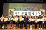 100세 시대를 맞아 전주지역 노인들의 행복하고 건강한 노후생활을 함께 염원하는 노인의날 기념식이 열렸다. 전주시와 대한노인회 전주시지회(지회장 홍성언)는 14일 전주학생교육문화관 공연장에서 우범기 전주시장과 최주만 전주시의회 부의장, 김두봉 대한노인회 전북특별자치도연합회장, 표창 수상자 등 1200여 명이 참석한 가운데 ‘제29회 전주시 노인의날 기념식’을 가졌다. 송민주 대한노인회 전주시지회 사무국장의 사회로 진행된 이날 기념식은 △무지개예술자원봉사단(단장 고대현)과 아름다운 실버 전주의꽃(단장 김인식)의 식전 공연 △노인 강령 낭독 △청려장(장수지팡이) 수여 △전주시장 및 전주시의장 표창 수여식 △노인복지공로자에 대한 공로장 수여식 등의 순으로 진행됐다. 특히 우범기 전주시장은 이날 기념식에서 올해 100세를 맞이한 김옥순 어르신(여, 덕진동)에게 무병장수의 상징인 청려지팡이를 전달했으며, 홍성언 지회장은 축하의 꽃다발을 선물했다. 홍성언 대한노인회 전주시지회장은 “풍성했던 한가위도 지나가고, 땀과 노력으로 이뤄낸 결실의 계절 가을을 맞이해 참석해 주신 우범기 전주시장님, 최주만 전주시의회