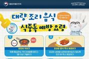 ■ 대량 조리 음식 식중독 예방요령 ① 완전히 익히기 육류 중심온도 75°C(어패류 85°C) 1분 이상 가열하기 ② 조리된 음식 즉시 제공하기 조리된 상태로 상온에 방치되지 않도록 조리 후 즉시 제공하기 ③ 가열 조리 후 신속히 냉각하기 가열 조리 후 즉시 섭취하지 않을 시, 여러 용기로 나누어 담거나 신속히 냉각하기 ④ 보관온도 유지하기 따뜻한 음식은 60°C 이상, 차가운 음식은 5°C 이하로 보관하기 ⑤ 재가열하여 섭취하기 보관된 음식 섭취 시, 충분히 가열 후 섭취하기 ■ 운반 시 식중독 예방 요령 · 차량·운반기구 청결히 관리하기 - 오염되기 쉬운 곳 세척·소독하고 청결 상태 수시로 확인하기 · 운반 시 음식 온도 관리 주의 - 따뜻한 음식과 차가운 음식이 서로 닿지 않게 구분하기 · 안전하게 포장하기 - 음식이 새거나 오염되지 않도록 완전히 밀폐되게 포장하기 · 운반 후 즉시 제공하기 - 음식 운반이 완료되면 즉시 제공하기