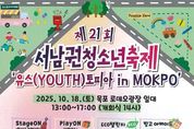 제21회 서남권청소년축제가 ‘유스(YOUTH)토피아 in MOKPO’를 주제로 오는 10월 18일(토) 오후 1시부터 5시까지 목포 로데오광장 일대에서 열린다. 이번 행사는 목포시가 주최, 서남권청소년축제추진위원회가 주관, 전라남도교육청이 후원하며, 전남 서남권 청소년과 청소년지도자, 시민 등 1,000여 명이 참여할 예정이다. 축제는 식전공연과 ▲경연프로그램(StageON) ▲체험부스운영(PlayON) ▲참여형 프로그램(7종) 등 다채로운 내용으로 진행된다. 식전공연에서는 목포백련초등학교 6학년 임사랑 학생의 국악공연과 비보이팀 뉴웨이브의 무대, 그리고 국악·비보이·디제잉이 어우러진 콜라보 공연이 펼쳐진다. 이어 StageON 경연무대에서는 보컬·댄스·밴드 등 26개 팀이 두 차례(오후 1시~1시 40분, 오후 2시 30분~4시 30분)에 걸쳐 열띤 경연을 펼친다. 또한 청소년동아리 및 청소년기관 55개 팀이 참여하는 체험프로그램(PlayON)과 참여형 프로그램 7종도 운영된다. 대표 프로그램으로는 ▲환경보호와 건강을 동시에 실천하는 ECO 챌린지(줍깅) ▲현장 미션과 퀴