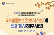 추석 연휴 유실·유기동물을 발견하거나, 반려동물을 잃어버렸다면 국가동물보호정보시스템에 신고·게시해주세요! ■ 추석 연휴 유실·유기동물 구조 통합 신고시스템 운영으로 신속한 온라인 신고·접수 가능 · 기간: 2025.10.2.(목)~10.10.(금) · 신고 게시: 국가동물보호정보시스템 누리집 팝업창 ■ 유실·유기동물 온라인 신고·접수 방법 ① 유실·유기동물을 발견한 경우 국가동물보호 정보시스템 '동물발견' 배너 클릭 → 발견장소, 사진, 개체 특징 등 제보 등록 → 해당 지자체 보호센터 정보제공 → 지자체 동물보호센터 신속 대응 ② 반려동물을 분실한 경우 국가동물보호 정보시스템 '동물분실' 배너 클릭 → 반려동물 분실장소, 일시, 사진 등 정보 등록 → 시민 간 발견 정보 공유(댓글 창 활성화) → 필요시 분실신고 병행(등록동물 정보 변경) 유실·유기동물 구조 통합신고로 보호자를 빠르게 찾아드리겠습니다