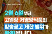 ■ 2월 6일부터 고열량·저영양식품의 방송광고 제한 범위가 완화됩니다. 17~19시 모든 프로그램 → 17~19시 어린이 주시청대상 프로그램 어린이 대상 드라마·퀴즈·게임·다큐멘터리· 애니메이션, 어린이 교육 및 정보 등