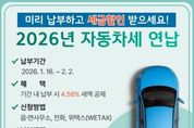 장흥군은 15일 2026년도 자동차세 연납 고지서를 장흥군에 등록된 모든 차량 소유자에게 일괄 발송했다고 밝혔다. 자동차세 연납 제도는 매년 6월과 12월 두 차례로 나눠 부과되는 정기분 자동차세를 1월에 미리 납부하면 공제 혜택을 주는 제도다. 올해도 1월 중 납부 시 4.5%의 세액 공제가 적용되며, 최근 어려운 경제 상황 속에서 가계 부담 완화에 도움이 될 것으로 군은 기대하고 있다. 납부 기한은 2026년 1월 16일부터 2월 2일까지이며, 납부 기간 내에 연납 고지서를 기반으로 납부를 완료하면 별도 신청 없이도 자동으로 세액 공제가 반영된다. 납부는 금융기관 창구, 위택스 온라인·모바일 앱, 인터넷 지로, ARS 등 다양한 방법으로 가능하다. 연납 후 타 시·도 전출입이나 주소 변경이 있어도 추가 세금 부담이 없으며, 연납 후 차량 폐차 또는 양도 시 일할 계산에 따라 잔여 세액을 환급받을 수 있다. 장흥군 관계자는 “고지서를 받으신 군민들은 납부 기한 내에 꼭 연납을 완료해 세금 절감 혜택을 누리시기 바란다”고 말했다.