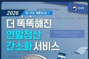 더 똑똑해진 연말정산 간소화 서비스 2026년 1월 15일 개통합니다! ■ 더~욱 새로워진 연말정산 간소화 서비스 기존 42개 자료+ 3개 자료 추가 1. 발달 재활 서비스 이용 증명 2. 장애인 활동 지원 급여 본인 부담금 자료 3. 체육시설 이용료 자료 ■ 더~욱 정교해진 소득 기준 초과 부양가족 명단 제공 소득 금액 100만 원 초과 부양가족에 대한 정보 연말정산 간소화 서비스 자료 조회 화면에서 안내 * 근로소득만 있는 경우 총급여 500만 원 - 소득 기준 초과 부양가족 내역 * 자세한 사항은 국세청 블로그를 참고해주세요! ■ AI 전화 챗봇 상담 - 국세 상담센터: ☎126→0번→0번(상담사 또는 AI 상담사 연결) - 세무서: 대표번호→2번→6번(AI 상담사 연결) (AI 상담사) · 주민등록번호 입력 후 본인인증 연말정산 간소화 자료 일괄 제공 현황, 부양가족의 간소화 자료 제공 동의 현황 등 · 생성형 AI 챗봇 상담 시범 운영 경로→홈택스 접속→홈택스 퀵메뉴→챗봇 상담 클릭 *홈택스 ■ 연말정산 유의 사항! 최종 확정된 자료는