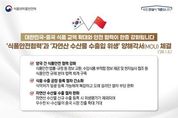 대한민국-중국 식품 교역 확대와 안전 협력이 한층 강화됩니다. - '식품안전협력'과 '자연산 수산물 수출입 위생' 양해각서(MOU) 체결('26.1.5.) 양국 간 식품안전 협력 강화 식품안전 법률·규정 등 정보 교환, 수입식품 부적합 정보 제공 및 현지실사 협조 등 식품안전 규제 분야 협력 체계 구축 식품 수출 공장 등록 절차 간소화 식약처가 일괄 등록 가능해져 복잡하고 오래 걸리던 절차 부담 완화 자연산 수산물 수출 절차 완화 자연산 수산물 신규 수출 등록 시 위생평가가 제외되어 우수한 K-수산물의 중국 시장 진출 확대 기대 "식약처는 국제 협력을 통해 K-푸드의 글로벌 경쟁력 강화와 수출을 적극 지원하겠습니다."